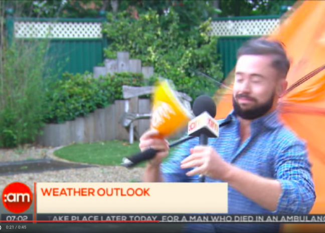 Во время прямого эфира телепередачи Ireland AM в пятницу Хартигана, рассказывавшего о погоде, отнесло в сторону сильным порывом ветра. Спустя несколько секунд ведущий сумел вернуться в кадр, однако его зонт оказался сломан, отмечает РИА-Новости.
