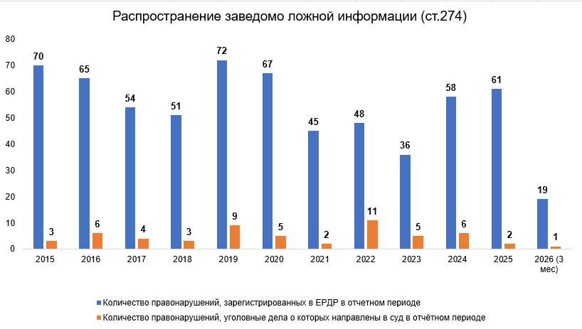Уголовная ответственность за распространение заведомо ложной информации появилась в Казахстане в 2015 году. За прошедшие 11 лет по этой статье (ст. 274 УК РК) было возбуждено 646 дел. В 2026 году только за первые три месяца начато уже 19 расследований. При этом статистика выявляет аномалию: до суда доходит лишь малая часть производств — в среднем 5 дел в год. За все время существования статьи до судебного разбирательства дошло лишь 57 дел (8,8%). Такая «сверхнизкая» результативность подтверждает опасения правозащитников: статья 274 используется больше как рычаг давления. Подозреваемый может провести полгода в ИВС или под домашним арестом, пока идет следствие, которое в итоге может быть закрыто с формулировкой «за отсутствием состава преступления».