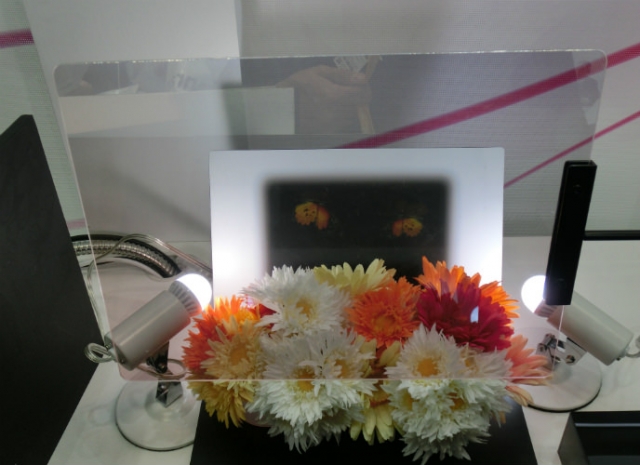 Пленка из нового материала, отражающего определенные волны, соответствующие синему, красному и зеленому цветам, нанесенная на стекло, превращает его в проекционный экран. Несмотря на то что отражение излучения с выбранными длинами волн приближается к 100%, визуально стекло остается прозрачным.