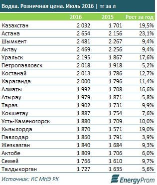 Цены на водку в розничных точках продаж за год поднялись на 19,5%, до 2032 тенге за литр по итогам августа 2016 года. Наиболее высокая цена среди крупных городов и мегаполисов РК отмечена в Астане - 2654 тенге за литр, плюс 23,1% за год (самые высокие темпы роста), и Шымкенте - 2481 тенге за литр, плюс 9,4% за год. Наиболее низкая - в Талдыкоргане (1727 тенге за литр, плюс 5,6% за год).