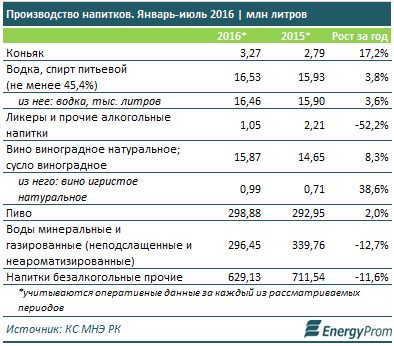 Объемы производства водки за год увеличились на 3,6%, до 16,5 млн литров. На 2% - до 298,9 млн литров - увеличился выпуск пива. Спад отмечен только в сегменте ликеров - минус 52,2%, до 1,1 млн литров. Выпуск безалкогольных напитков, напротив, упал во всех сегментах: минеральной и газированной воды - на 12,7%, прочих - на 11,6%. Производство напитков входит в приоритетные отрасли ГПИИР на 2015-2019, отмечает аналитическая служба Finprom.kz.