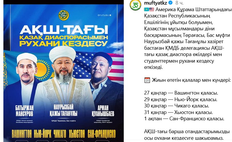 «На фоне того, что на уровне Конституционного совета государственные деятели, озабоченные будущим страны, выдвигают предложения о необходимости более четкого закрепления принципа отделения религии от государства в Конституции, глава ДУМК, взяв с собой двух проповедников, отправился в США. Сообщается, что они намерены провести так называемые «духовные встречи» с казахской диаспорой и студентами», — написал журналист на своей странице в Facebook.