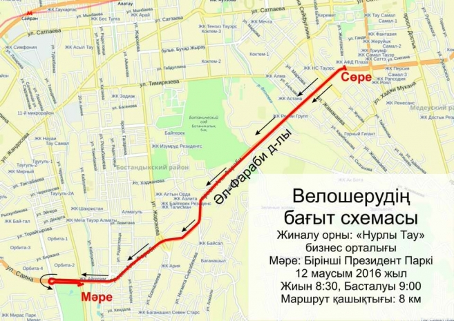Традиционный еженедельный велопробег стартует с территории бизнес-центра «Нурлы-Тау». Оттуда велоколонна направится по проспекту Аль-Фараби в восточном направлении и финиширует в Парке Первого Президента с разворотом на улице Мустафина. Сбор: 8:30, БЦ «Нурлы-Тау».