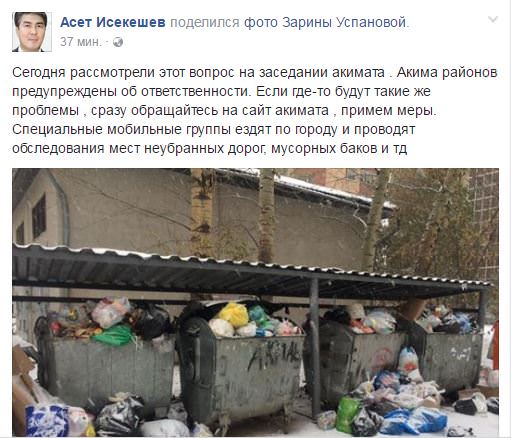 На своей странице в социальной сети Facebook Асет Исекешев напомнил подчиненным об ответственности за неубранный мусор, передает Total.kz.