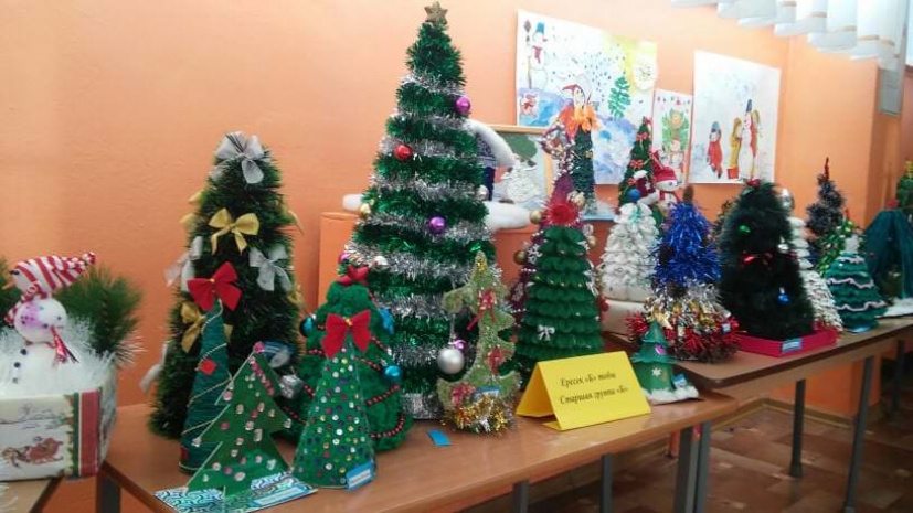 Елки здесь на самый разный вкус, причем, в прямом смысле слова. Один из малышей, к примеру, слепил вечнозеленую из соленого теста. Получилось оригинально. Также в экспозиции красуются елки из журналов, мишуры и даже вязаные.