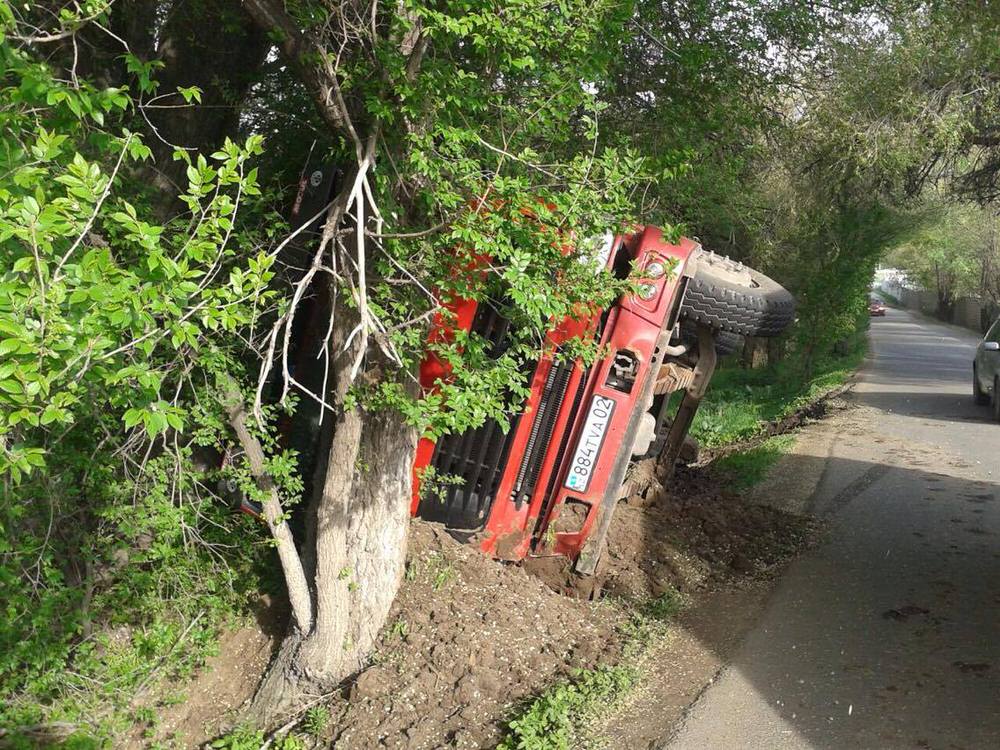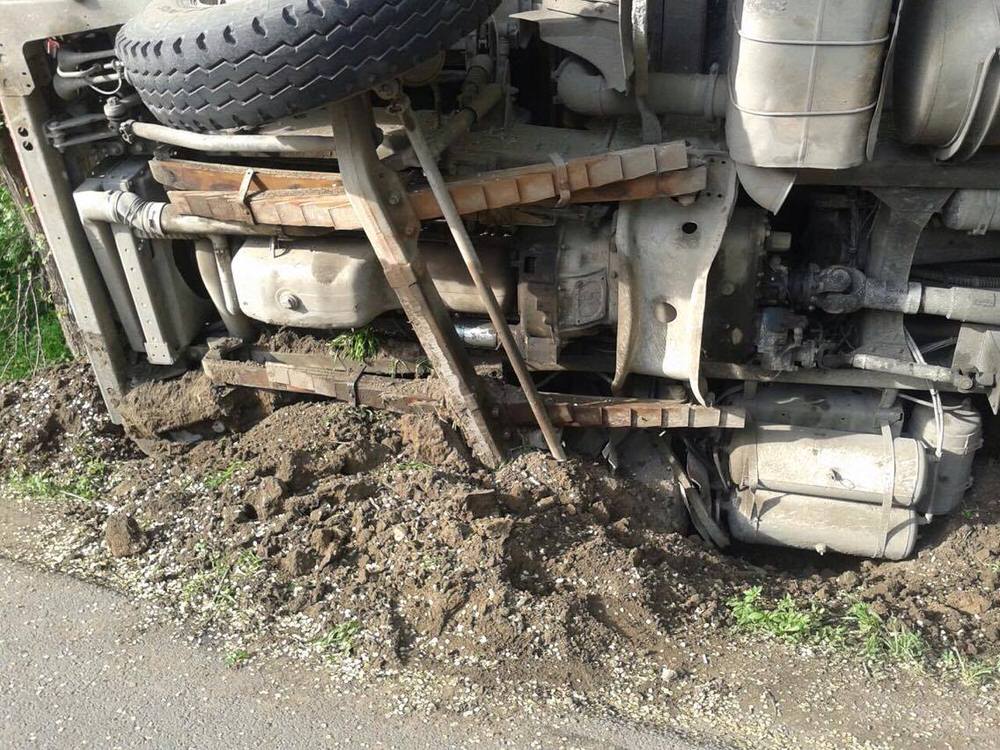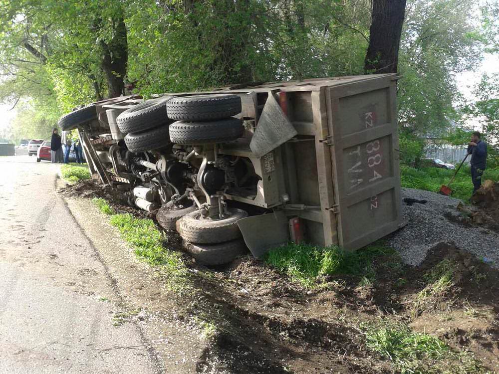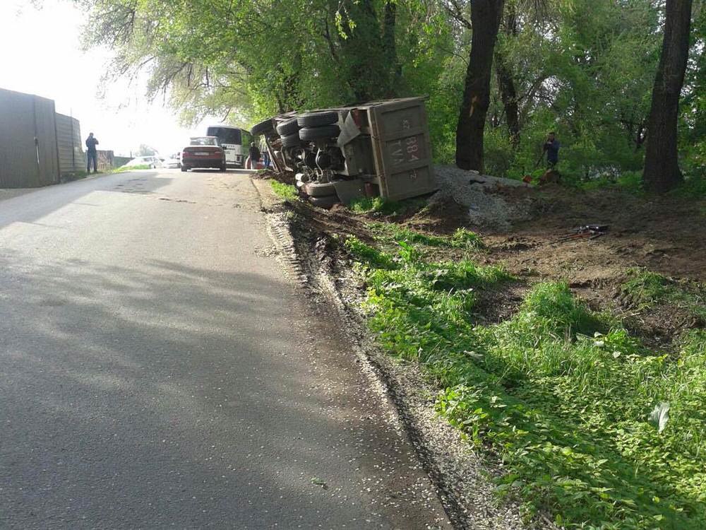 Водитель автомобиля, груженого щебнем, пытаясь уйти от лобового столкновения с бетономешалкой, не справился с управлением. В результате чего большегруз перевернулся.
