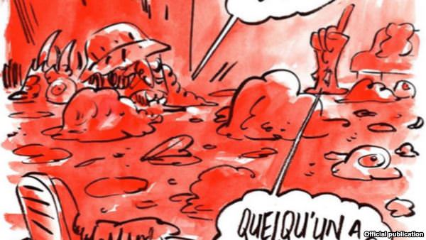 В другой карикатуре в кроваво-красных тонах, изображены человеческие тела, разбросанные по помещению после взрыва. Как следует из фраз на рисунке, после теракта бельгийцы ворчат: «Вечно не по расписанию» и «Кто-нибудь знает, где мой багаж?»