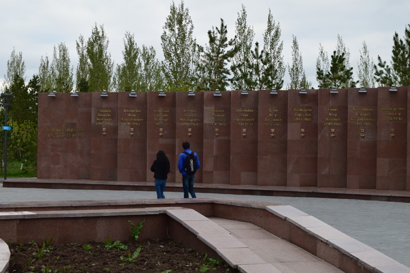 Здесь в гранитных плитах увековечена память 28 воинов из личного состава 4-й роты 2-го батальона 1075-го стрелкового полка, которые в ноябре 1941 года во главе с политруком В. Г. Клочковым держали оборону в районе разъезда Дубосеково под Москвой, уничтожив в ходе 4-часового боя 18 вражеских танков. Практически все герои - уроженцы Алматы.