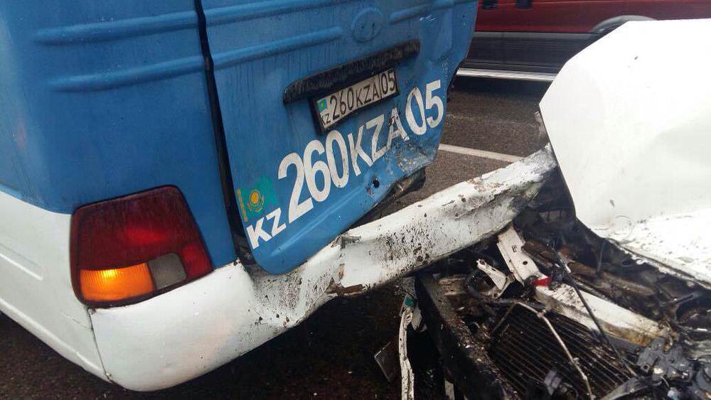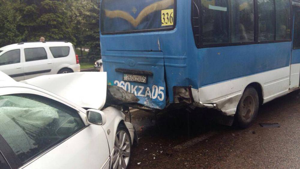 Инцидент произошел на перекрестке Гагарина – Жандосова. Два автомобиля и маршрутный автобус стояли на перекрестке, ожидая зеленый сигнал светофора, а когда началось движение, в автобус на большой скорости врезался автомобиль Toyota Сamry. Далее по инерции автобус протаранил Hyundai, эта машина, в свою очередь, врезалась в Volkswagen.