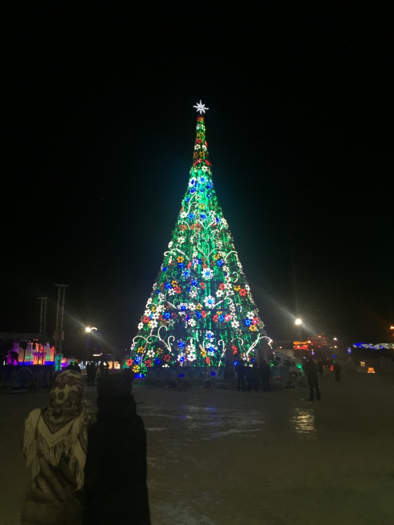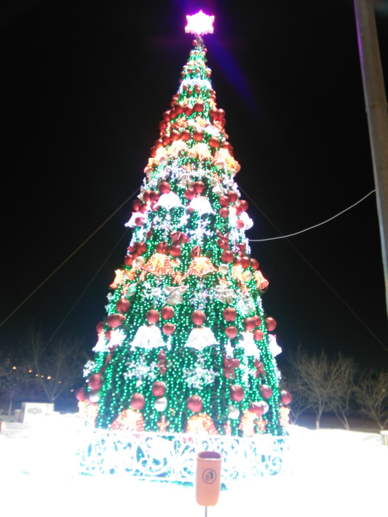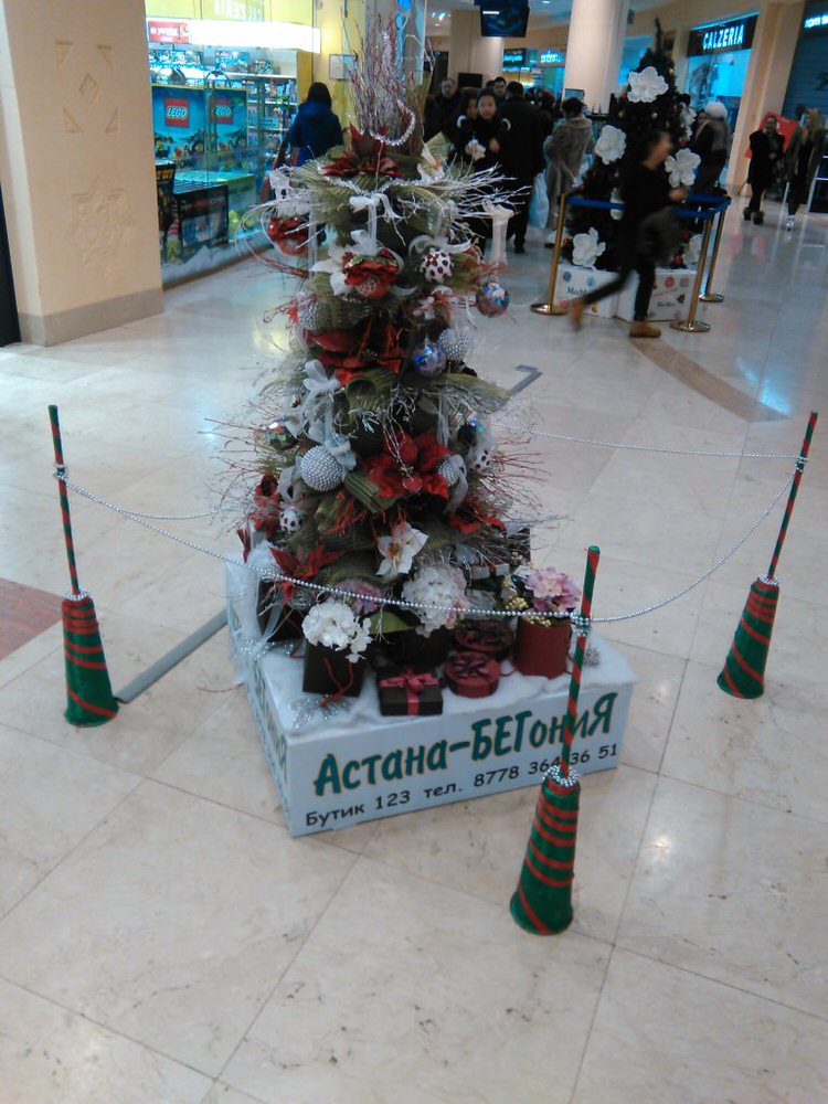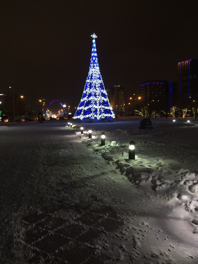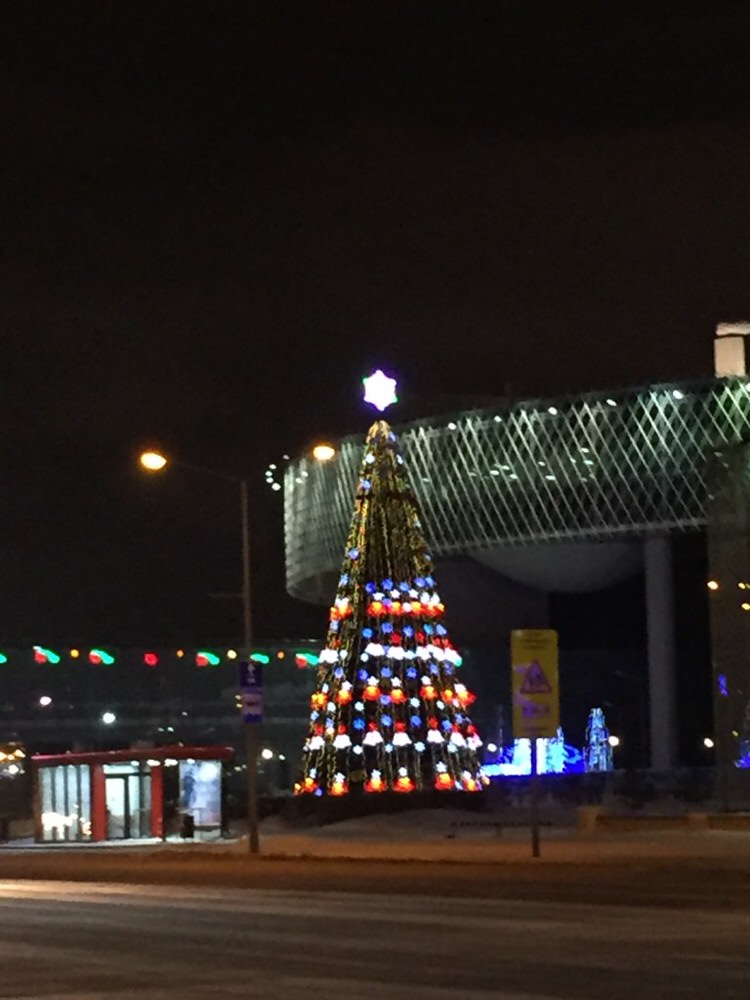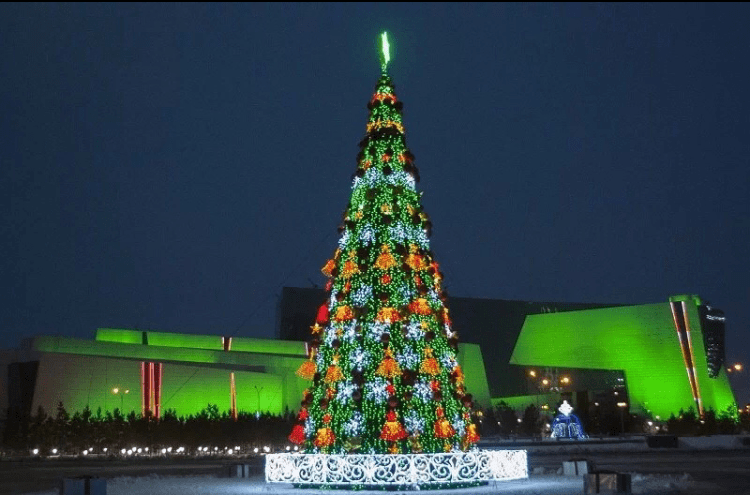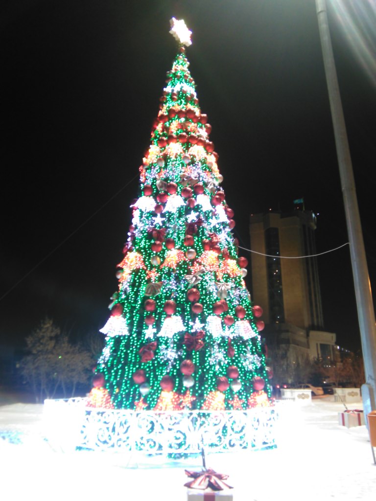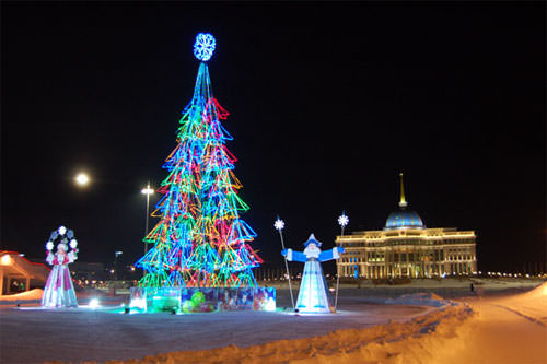 Однако самой удивительной можно назвать новогоднюю красавицу, установленную на площади перед «Ак Ордой». Креативные дизайнеры постарались на славу. И перед резиденцией президента стоит вот такая необычная елка!