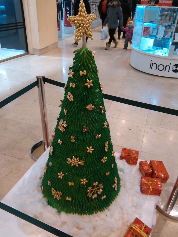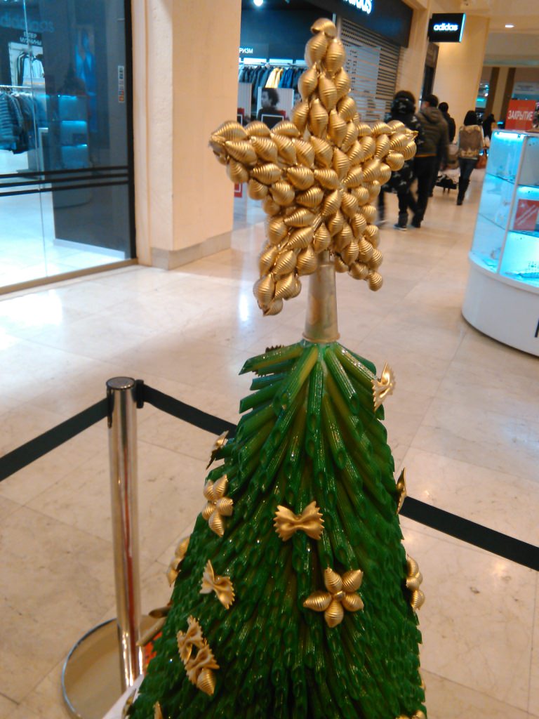 Самые необычные новогодние красавицы расположились в холлах «Керуена». Здесь представлены елки из макарон.