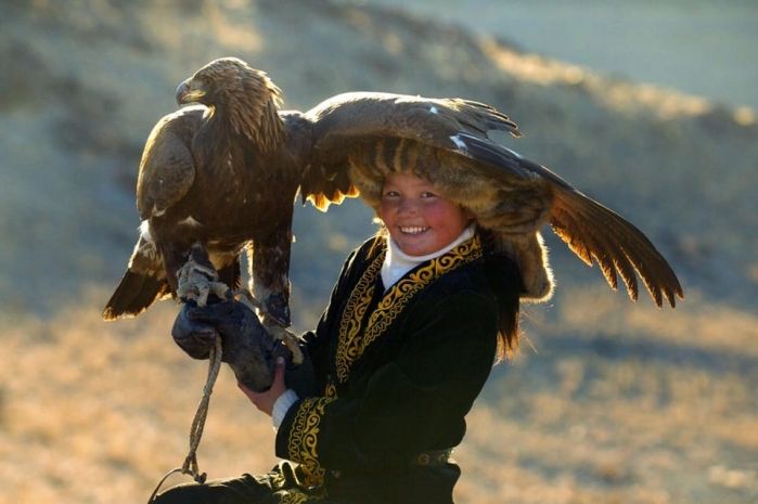 Дети в возрасте 13 лет начинают учиться охоте на зайцев и лис с помощью огромных птиц. Казахи в горах Монголии являются одним из немногих народов, охотящихся с беркутами.  Во время своей поездки фотограф случайно познакомился с 13-летней дочерью опытного охотника, которая, по его мнению, единственная девочка, изучающая редкое ремесло.