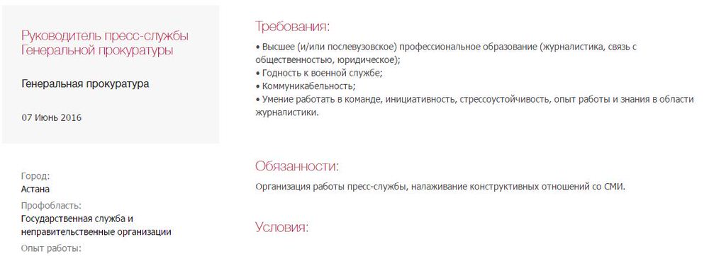 Стало известно, что Генеральная прокуратура ищет руководителя пресс-службы. Такое объявление 7 июня опубликовал электронный портал «Центр карьеры ассоциации Болашак». Требования к кандидату вполне обычные: высшее образование, годность к военной службе и коммуникабельность. А вот обязанности вызывают интерес. Наниматель настаивает на «налаживании конструктивных отношений со СМИ».