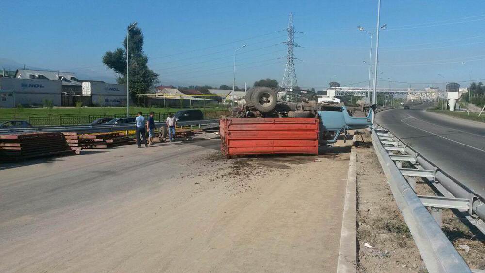 Грузовик перевернулся на развязке в Алматы