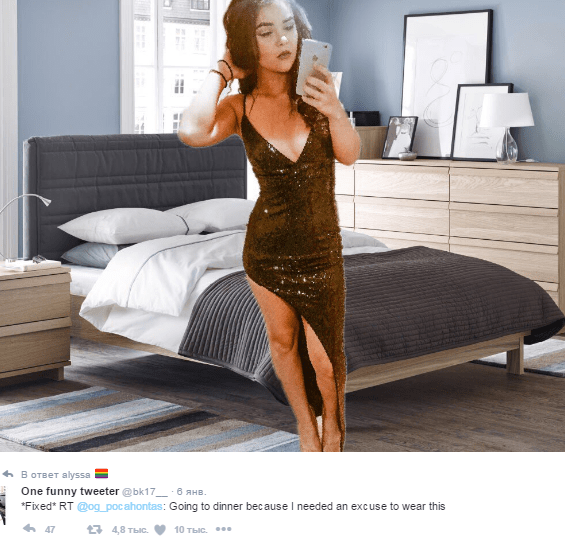 В комментариях совершенно разные люди отмечают, что гламурный наряд девушки довольно неуместно выглядит на фоне «такой» спальной комнаты: в ней повсюду разбросаны разные вещи и мусор. Комментаторы подробно рассмотрели снимок, разобрали, какие предметы лежат на полу, и дали множество советов по поводу уборки. Некоторые интузиасты с помощью Photoshop «переместили» Алису в убранное помещение.