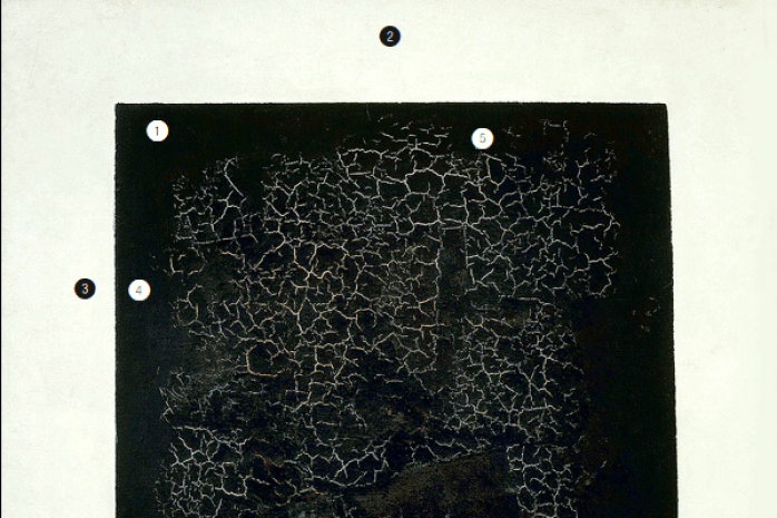 5 КРАКЕЛЮР*. Со временем «Черный квадрат» покрылся трещинками, через которые проступили иные цвета… Пошли разговоры: мол, под верхним слоем краски есть другое изображение: неудавшаяся картина, замазанная черным. Однако руководство Третьяковки, где хранится картина, не дает разрешения на рентгеновский тест из-за плохой сохранности полотна.