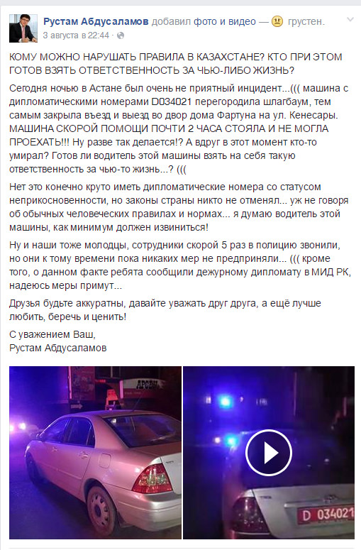 Ночью 3 августа автомобиль Toyota с дипломатическими номерами D034021 перегородил шлагбаум и тем самым заблокировал въезд во двор дома по улице Кенесары. Из-за этого к дому не смогла подъехать машина скорой помощи. Как рассказали очевидцы, скорая простояла у двора около двух часов.
