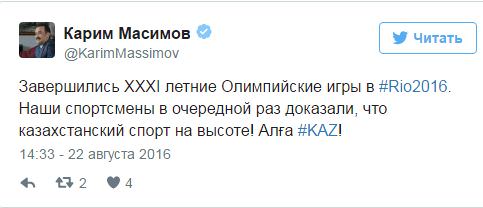 Наши спортсмены в очередной раз доказали, что казахстанский спорт на высоте – об этом премьер-министр Казахстана Карим Масимов написал в своем аккаунте в Twitter.