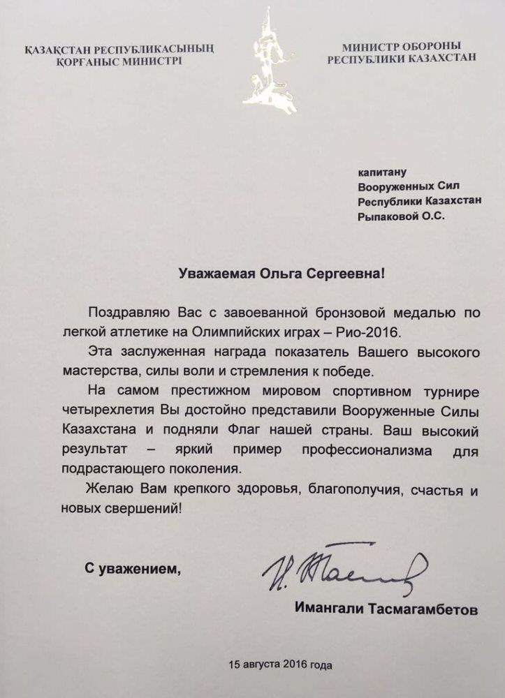 «Уважаемая Ольга Сергеевна! Поздравляю Вас с завоеванной бронзовой медалью по легкой атлетике на Олимпийских играх – Рио-2016! Эта заслуженная награда – показатель Вашего высокого мастерства, силы воли и стремления к победе. На самом престижном мировом спортивном турнире четырехлетия Вы достойно представили Вооруженные силы Казахстана и подняли флаг нашей страны. Ваш высокий результат – яркий пример профессионализма для подрастающего поколения», - отметил в поздравительной телеграмме министр обороны РК Имангали Тасмагамбетов.