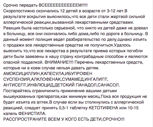 «Информация о летальных исходах, вызванных аллергическими реакциями после приема лекарственных средств, распространяемая посредством мессенджера WhatsApp и в социальных сетях, является недостоверной. Министерство здравоохранения и социального развития РК на постоянной основе проводит мониторинг побочных действий лекарственных средств. По состоянию на 19 сентября 2016 года оперативных данных о лекарственных препаратах (амоксициллин (капсулы), ибупрофен (суспензия), алклофенак, ангисепт, сумамед, ингалипт, инфлюцид, детский панадол и санасол), которые якобы вызвали аллергическую реакцию, что привело к смерти детей, не поступало», – говорится в сообщении министерства.