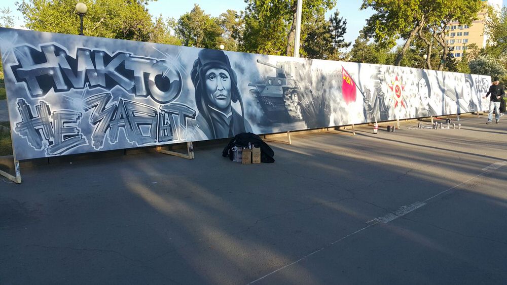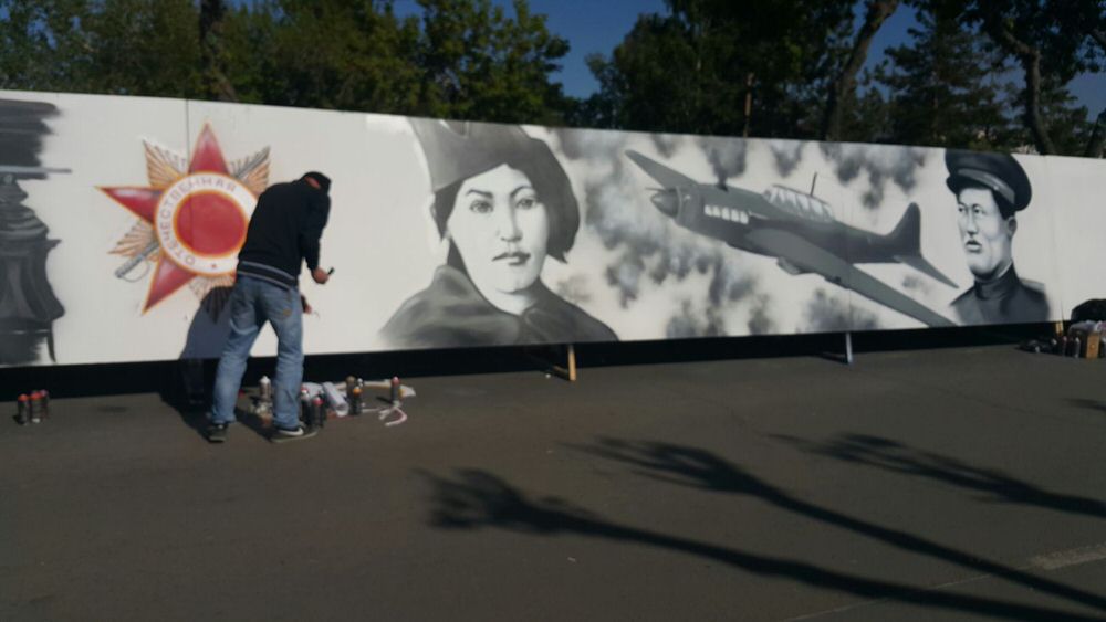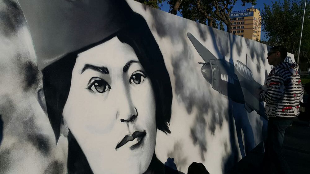 Трое павлодарских художников-граффистов в честь 71-й годовщины Победы в Великой Отечественной войне решили преподнести городу необычный подарок. Владимир Зубко, Василий Вдовин и Эвальд Мерк нарисовали 18-метровую панорамную картину в честь тех, кто сражался против фашизма. В качестве главных героев патриотической композиции они выбрали образы легендарного снайпера, Героя Советского Союза Алии Молдагуловой и командира взвода разведки 674-го стрелкового полка 150-й стрелковой дивизии, «Халық қаһарманы» лейтенанта Рахимжана Кошкарбаева, который первым водрузил знамя Победы над зданием Рейхстага.
