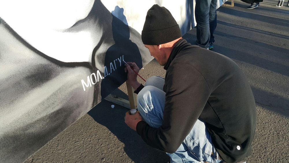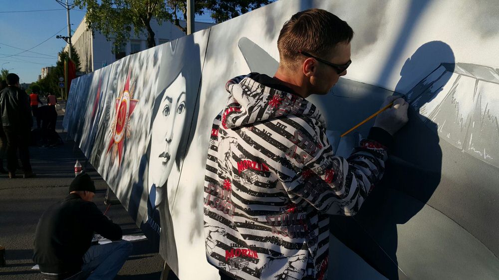 «Мы пришли на площадь вечером 8 мая, до четырех часов ночи рисовали контуры. С утра весь день подходили люди, интересовались, что это будет. Сначала, конечно, людям трудно было понять, каким в итоге будет картина. Обычно, если это граффити, многие думают, что это какая-то абстракция», - смеется 30-летний Василий Вдовин. Талантливый художник-самоучка работает на Павлодарском нефтехимическом заводе и все свое свободное время посвящает творчеству. Работа художников-граффистов несколько дней будет представлена на обозрение павлодарцев, после чего украсит фойе одного из общественных зданий города.