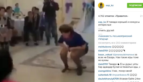 На официальной странице «Есьже я приезжий» в социальной сети появился видеоролик, на котором запечатлена непристойная игра с участием гостей. По правилам игры женщины должны были пропрыгать через весь банкетный зал на детском пони. На видео зафиксировано, как у одной из участниц задрался подол платья.