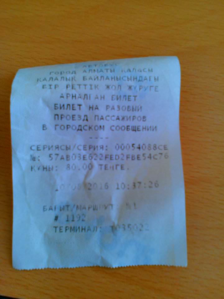 Вернемся к одноразовым билетам. Установка специальных транспортных терминалов началась еще 20 июня, и теперь приборчик можно видеть на большинстве маршрутов. Объяснения компании ТОО «Транспортный холдинг города Алматы» было весьма содержательным: «Это сделано для гостей города Алматы и таких категорий граждан, которые забыли карту или проездной, а также для тех, кто вовремя ее не пополнил или еще не успел приобрести». По словам представителей холдинга, билеты на разовый проезд введены дополнительно к транспортным картам и проездным. Просто заплатите водителю 80 тенге и получите билет.