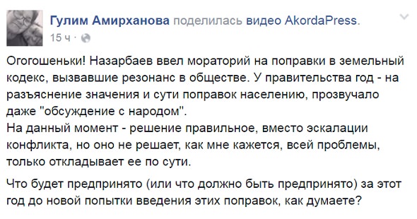 После того как президент Казахстана объявил о моратории на ряд норм Земельного кодекса, казахстанцы начали активно обсуждать решение главы государства, передает корреспондент агентства.