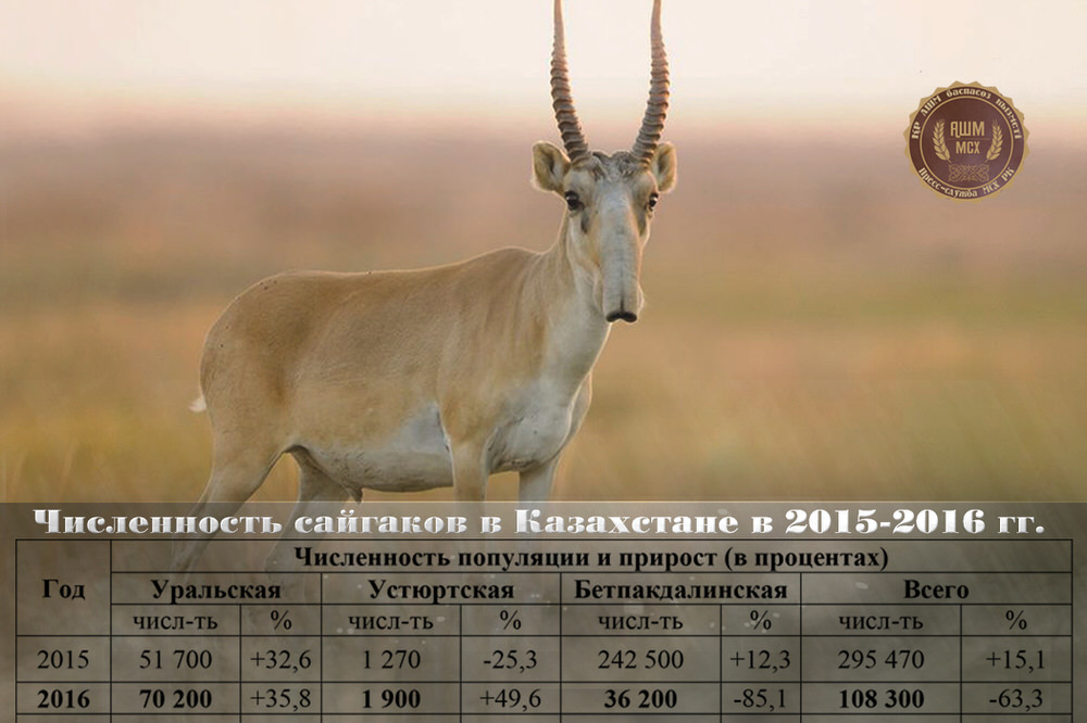По результатам авиаучета, общая численность сайгаков в 2016 году составила 108 300 особей, включая численность Бетпакдалинской популяции 36 200 особей, Уральской популяции 70 200 особей и Устюртской популяции 1900 особей.