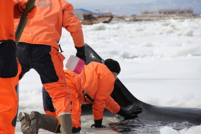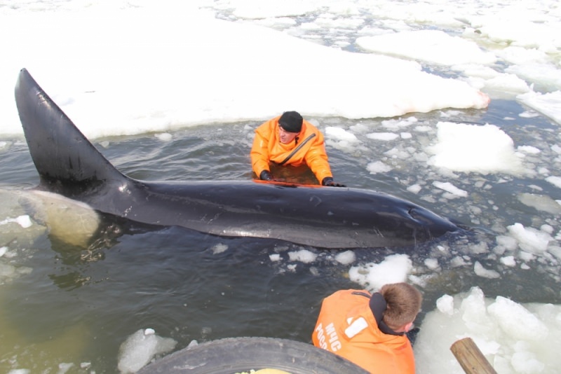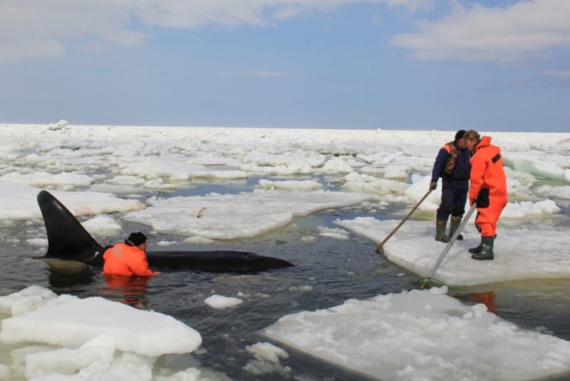 «Были использованы все возможности для спасения. Мы несколько часов, находясь в воде, отодвигали льдины и помогали косатке двигаться. Со льдин нам помогали коллеги, работая шестами. Помогли ей переместиться на более глубокое место. Однако, к большому сожалению, всё, что сейчас возможно – это освободить небольшой участок ото льда, чтобы она могла немного шевелиться. Это мы сделали. Но ледовое поле протянулось до горизонта, чистой воды даже не видно. Сделали всё, что могли. Хочу верить, что лед вынесет обратно в море и морские животные смогут спастись. Могу добавить, что то ли от усталости, то ли в самом деле понимала, что мы мы ее спасаем, но никакой агрессии косатка к нам не проявила. Ни малейшей. Хотя при работе мы довольно часто соприкасались с ней», - рассказал Дмитрий Михайлов, спасатель Сахалинского ПСО им. В.А. Полякова МЧС России.