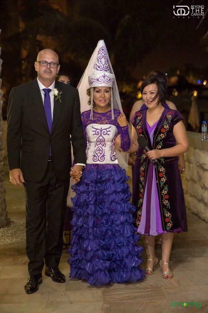 Родители невесты надели кийит (кыргызскую национальную одежду) на родителей Ибрагима. А его родители передали калын (конверт с деньгами, выкуп за невесту) и подарки. Таким образом, молодожены постарались провести свадьбу в лучших традициях двух народов.