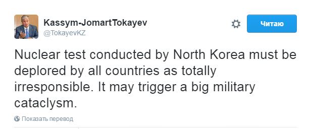 В своем twitter-аккаунте председатель сената парламента РК Касым-Жомарт Токаев осудил действия Северной Кореи, передает Total.kz.