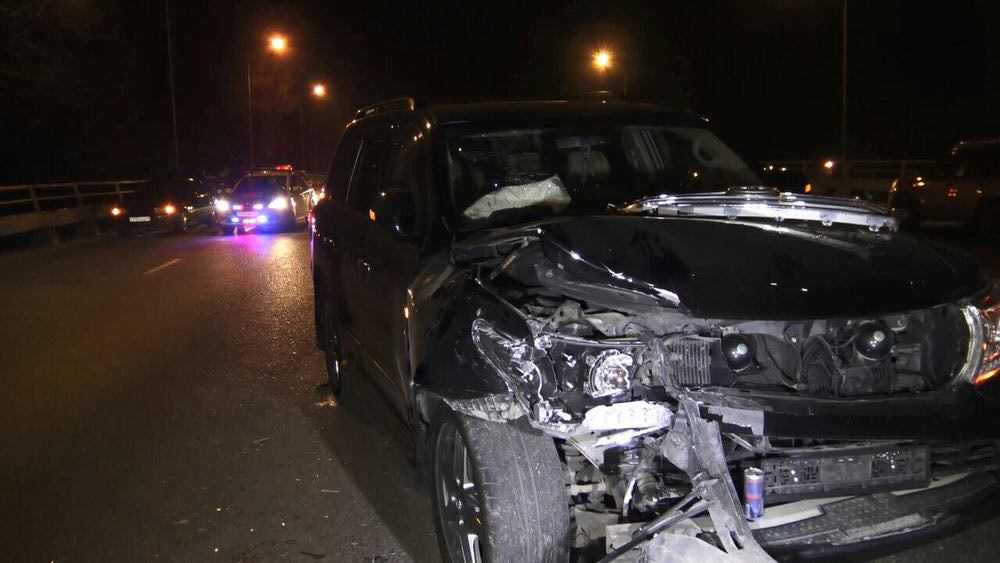 В то же время водитель проезжавшего мимо Toyota Land Cruiser 200 засмотрелся на аварию и сам устроил другую. Джип на полной скорости въехал в Mercedes, который отбросило в бетонное перекрытие.