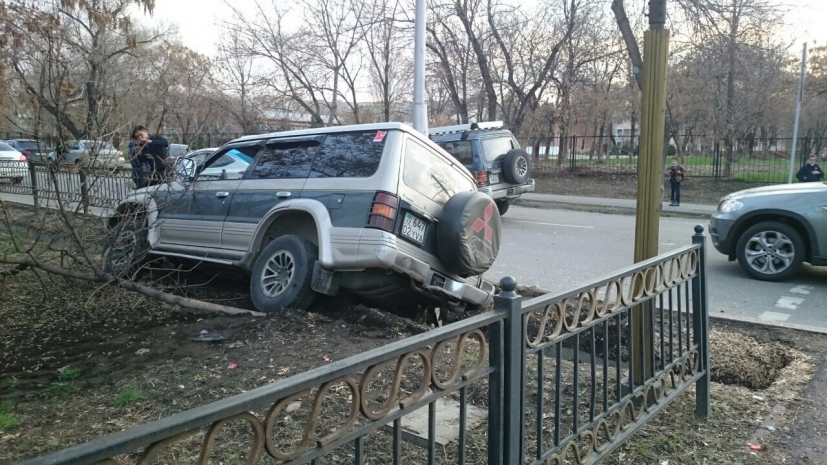 Cо слов очевидцев, серебристый внедорожник Mitsubishi Pajero выехал на перекресток на мигающий сигнал светофора, когда на зеленый выехал синий Pajero. В результате столкновения, серебристый автомобиль снес молодое дерево и вылетел в арык. Вторую машину занесло на середину перекрестка, где от силы удара вырвало переднее колесо. Пострадавших водителей и одного пассажира увезли в больницу.