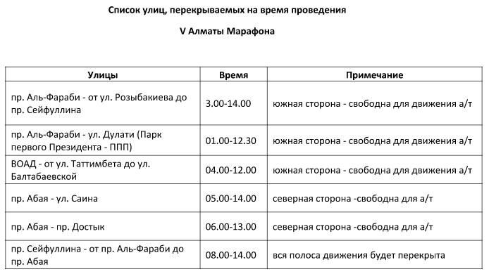 Оргкомитет Алматы Марафона информирует всех участников дорожного движения о том, что в день старта соревнований – 24 апреля 2016 года – будут перекрыты дороги, по которым проходят дистанции 10, 21 и 42 км.