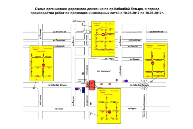 С 26 апреля по 10 мая будет перекрыта улица Керей-Жанибек хандар на пересечении с проспектом Кабанбай батыра. С 10 мая по 15 мая будет закрыт проезд по проспекту Кабанбай батыра на пересечении с улицей Орынбор.