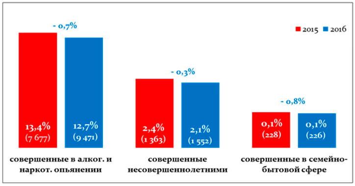 Выросло на 13,9% количество нарушений закона несовершеннолетними (1552 против 1363), а на 23,4% - преступлений, совершенных в состоянии алкогольного и наркотического опьянения (9471 против 7677). «При этом удельный вес таких преступлений, напротив, снизился: по преступлениям с участием несовершеннолетних на 0,3%, в состоянии алкогольного опьянения на 0,7%, в семейно-бытовой сфере на 0,1%», - отметили прокуроры.