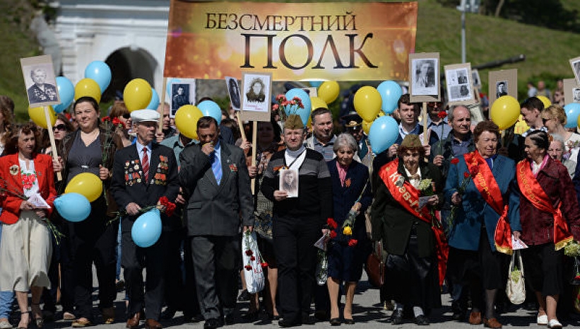 У участников были при себе георгиевские ленточки, маки (ставшие на Украине символом Победы) и портреты родственников, погибших во время Великой Отечественной войны.