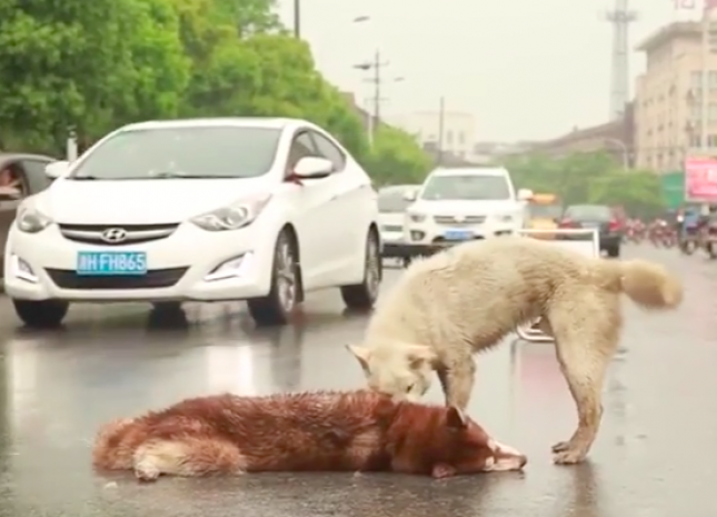 Дворняга в течение получаса пыталась «разбудить» хаски, который погиб под колесами автомобиля в китайской провинции Чжэцзян.