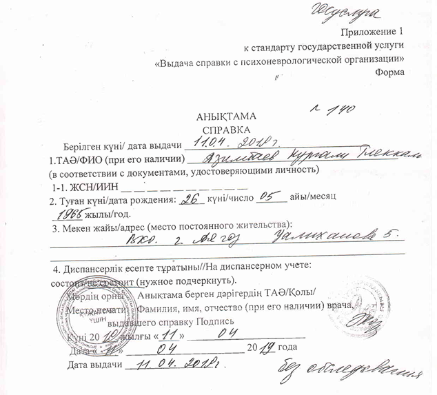 «Организованные группы против меня оклеветали меня, подделывали нереалистичные, ложные и не соответствующие действительности справки и публиковали в различных социальных сетях. С целью доказать, что я не состою на психоневрологическом учете, я прошел обследование у врача-психиатра. Психиатр после прохождения осмотра выдал мне справку о том, что я не состою на учете (справка прилагается). Более того Центр здоровья психической грамотности города Семея на письменный запрос Аягозской районной прокуратуры дал письменный ответ о том, что я не состою на «Д» учете. На основании вышеуказанных справок я подал в суд на лиц, оклеветавших меня (решение суда приложено). Решением Аягозского районного суда от 23 августа 2013 года суд удовлетворил мое исковое заявление и ответчики, оклеветавшие меня, выплатили мне моральный и материальный вред», — указал Нургали Азимбаев, приложив в качестве доказательства копии справки психиатра и решения Аягозского районного суда.