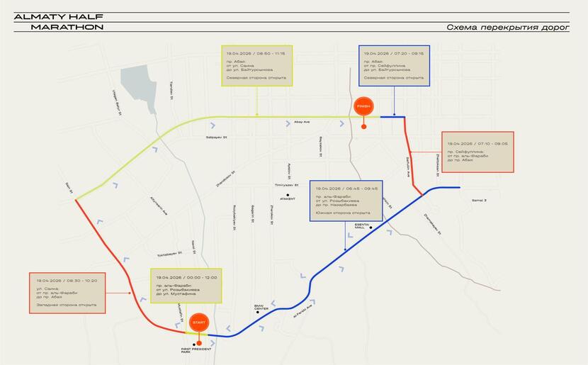 Старт начинается у Парка первого президента по проспекту аль-Фараби, финиш — на Центральном стадионе.