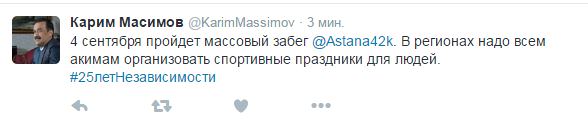 «4 сентября пройдет массовый забег @Astana42k. В регионах надо всем акимам организовать спортивные праздники для людей. #25летНезависимости», - написал в своем Twitter-аккаунте Масимов.