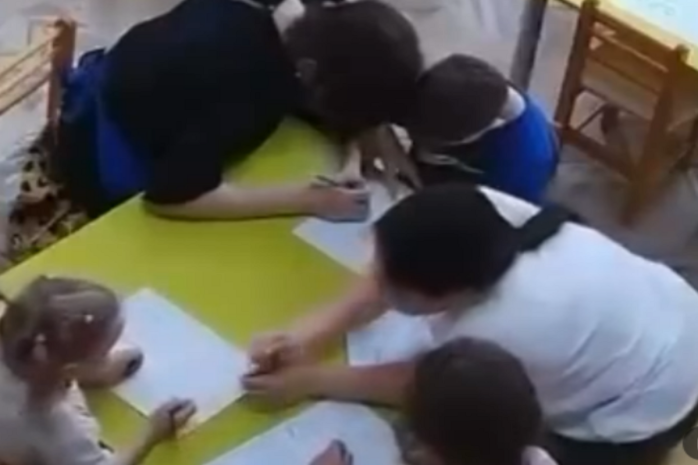Видео с камер наблюдения детского сада «Айголек» опубликовала мама воспитанницы дошкольного учреждения. На кадрах дети выполняют задание под надзором двух взрослых, одна из которых оказалась весьма неуравновешенной. Воспитатель несколько раз тычет в тетрадь и бьет ребенка по рукам и плечам.