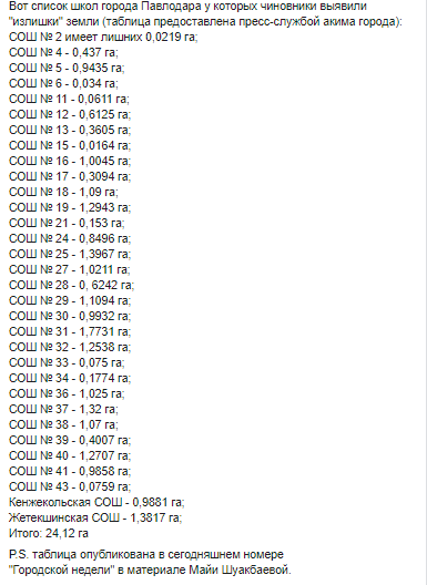 Между тем у павлодарских школ чиновники выявили 24 гектара «лишней» земли. Об этом написал журналист, житель Павлодара Александр Баранов на своей странице в Facebook.