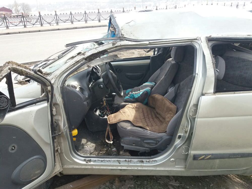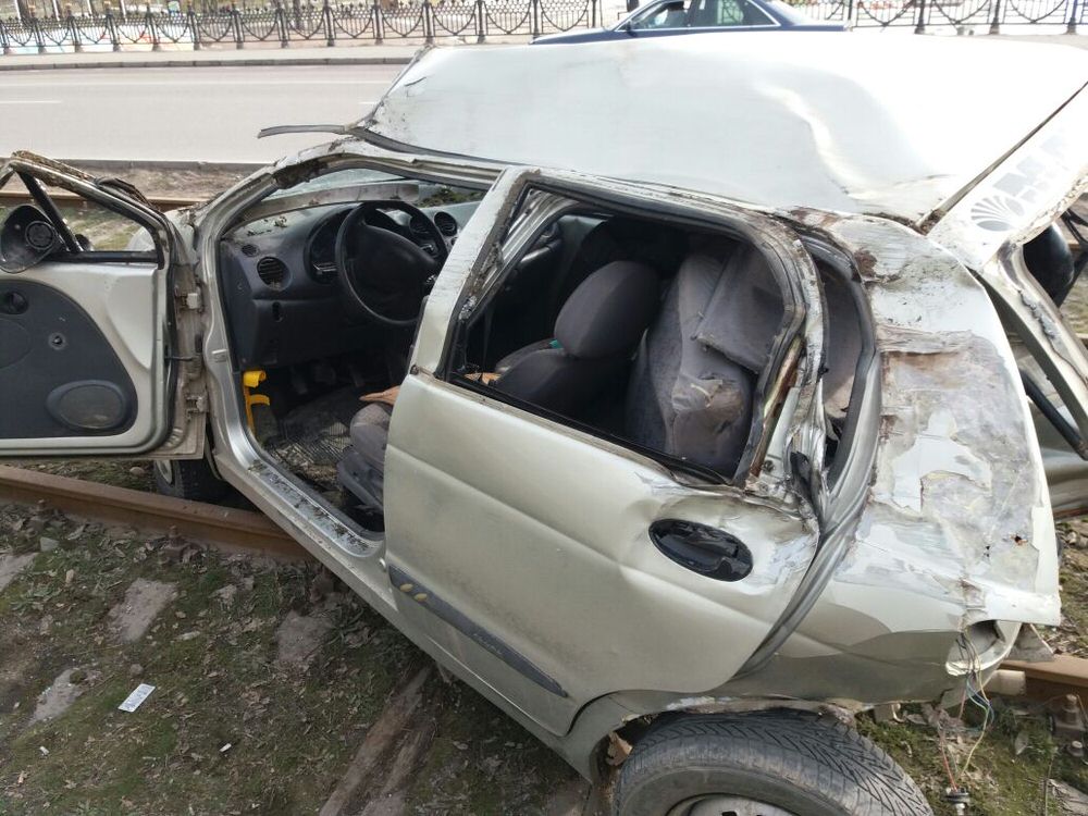 Daewoo Matiz в результате столкновения несколько раз перевернулся и остановился на трамвайных путях.