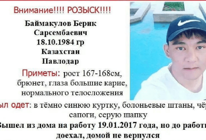 Еще один молодой мужчина – 33-летний Берик Баймакулов – пропал 19 января. Он вышел из дома на работу, но до нее так и не доехал. Домой Берик тоже не вернулся. В день своего исчезновения мужчина был одет в темно-синюю куртку, болоньевые штаны, черные сапоги, на голове была серая шапка.
