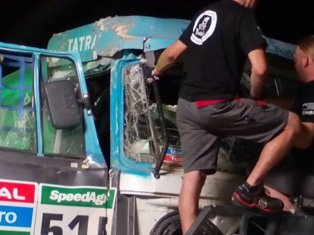 «На отрезке горного серпантина заклинило руль, автомобиль ушел с траектории и лег на бок, сообщает Zakon.kz. Проходящий рядом грузовик помог «Татре» встать на колеса. Конечно, потеряли время, на данный момент в абсолюте 27-е место. Позже технические комиссары посетили бивуак «Татры» и провели инспекцию. Главные требования - целостность каркаса, окна должны открываться, двери должны закрываться без усилий. Все требования выполнены. В шесть утра должна состояться последняя проверка. Но на 90% экипаж продолжит гонку.