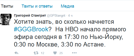 «Хотите знать, во сколько начнется #GGGBrook? На НВО начало прямого эфира сегодня в 17:30 по Нью-Йорку, 0:30 по Москве, 3:30 по Астане», - информировал Стангрит.