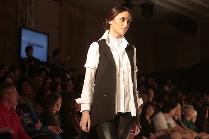 Одежда осень-зима 2014/2015 от Алексея Чжена удобна и практична. Серые и черные тона, оттененные яркими пятнами лимонно-желтого и кипельно-белого, хлопок, бархат и кожа, многослойные конструкции из нескольких тончайших сорочек, а в завершение образа причудливые головные уборы, отдаленно напоминающие маску Бэтмена. Зал встретил творение мастера бурными аплодисментами. Стильная и в то же время комфортная одежда наверняка покорит сердце не одной казахстанской модницы.